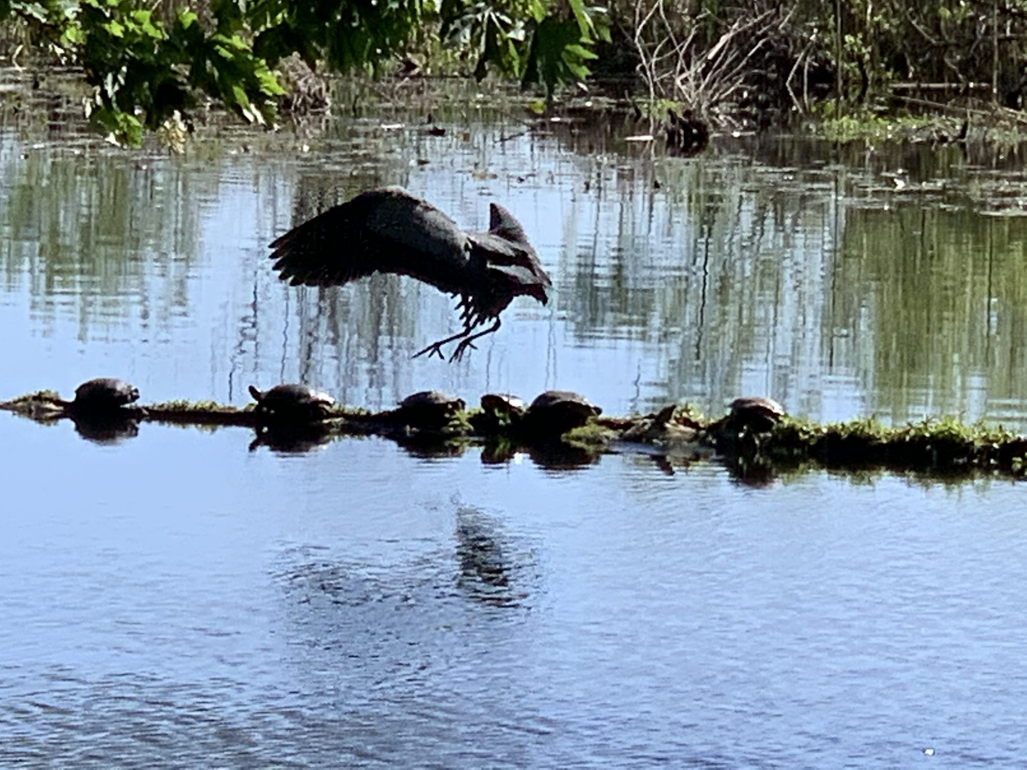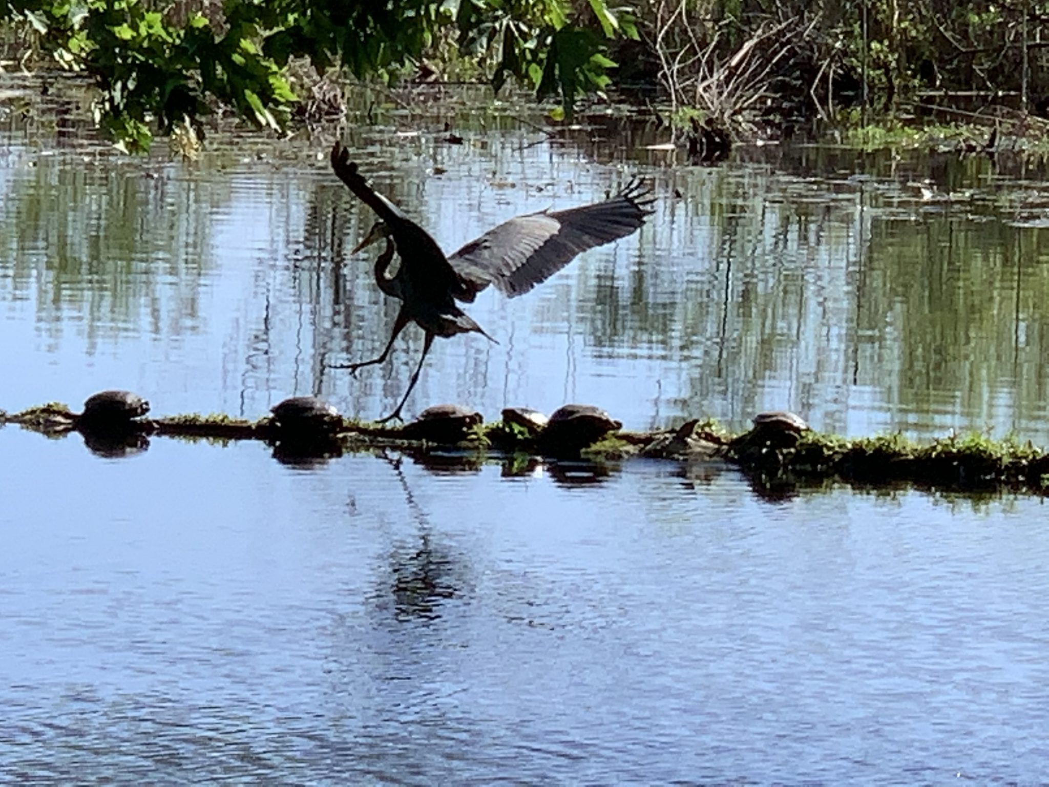 During coronavirus I have taken many bird photos. This triptych shows the heron jumping over turtles basking in the sun on a log. The photos were taken on my iPhone in the arboretum.