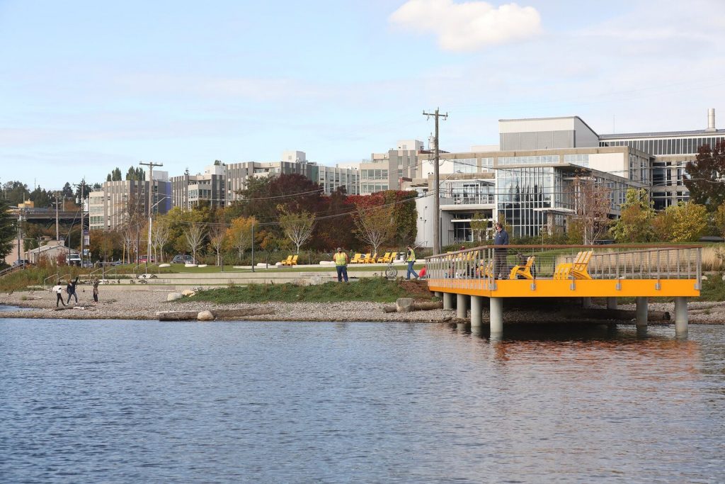 The low-slung vantage on Northeast Boat Street is unique among the city’s public spaces, placid compared to the hustle and bustle on the bridges in the distance. “It’s a pretty spectacular spot,” said David Graves, a Seattle Parks and Recreation planner who worked on the project.