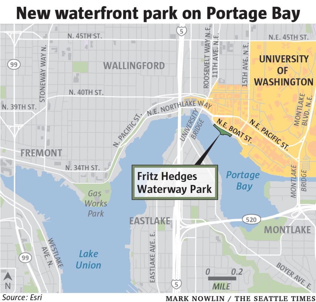 There’s a new waterfront park with a rocky beach in Seattle, squeezed below the University of Washington, along Portage Bay. The 3.5-acre space opened discreetly Wednesday without an on-site celebration.